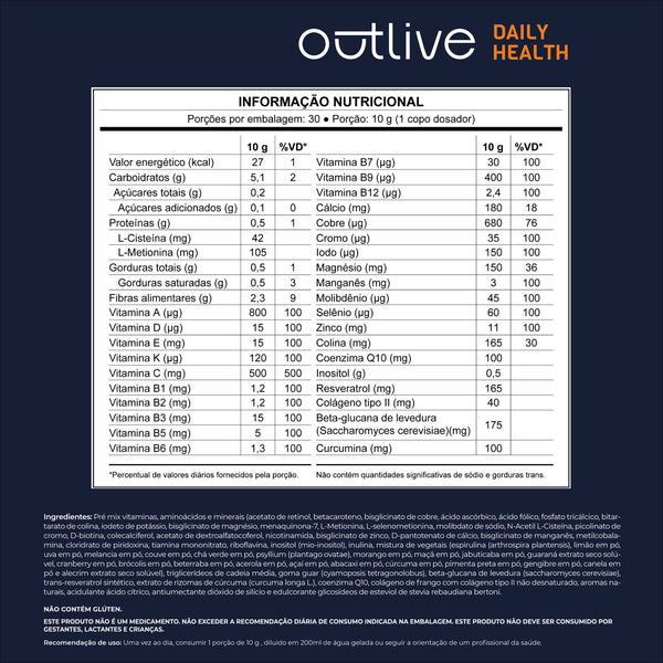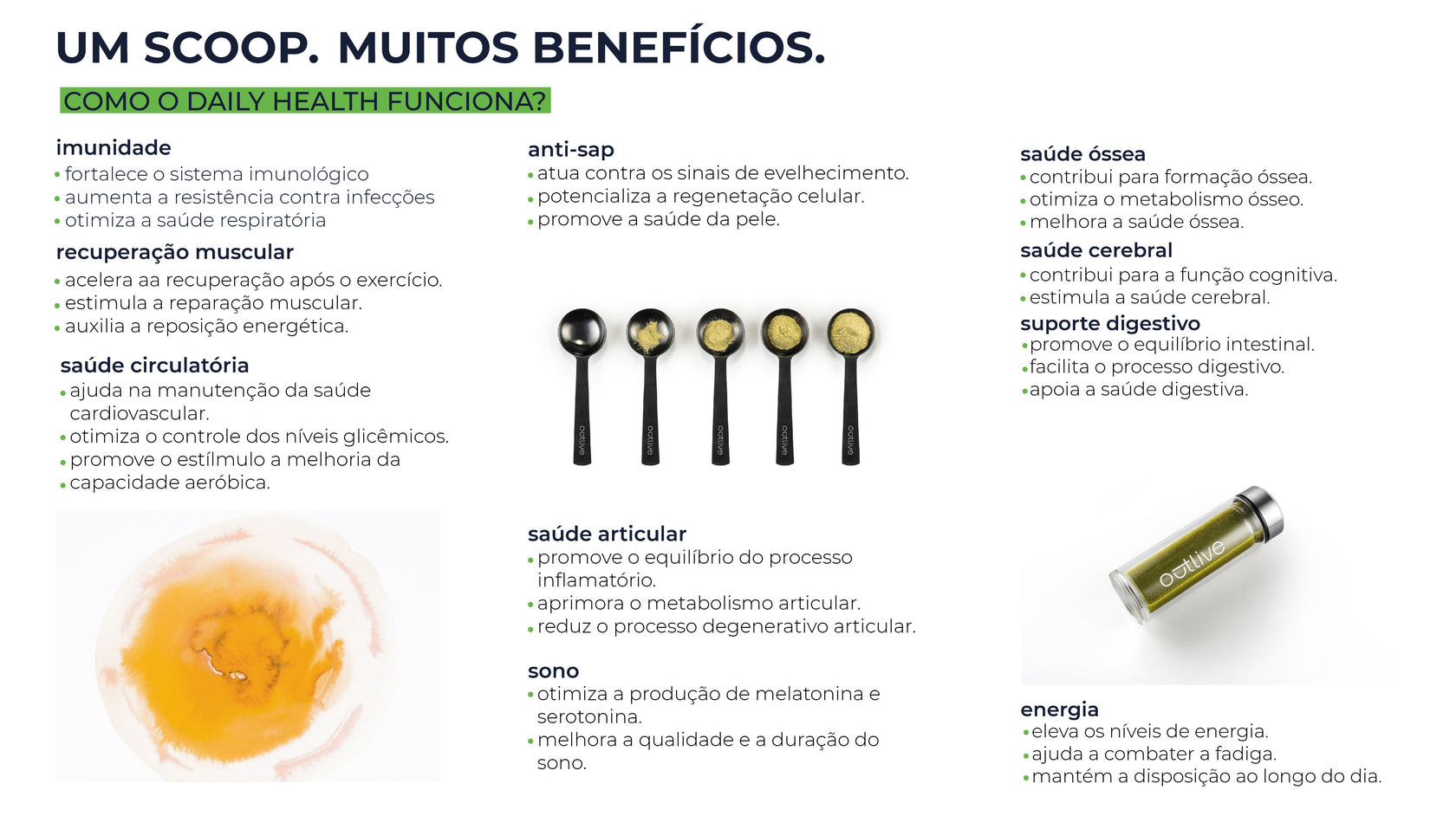 O Daily Health foi criado para fazer parte da sua rotina matinal, com 62 ingredientes fundamentais, entregando nutrição completa, prática e essencial para começar o dia na sua melhor versão. Uma fórmula MORE IN ONE, com vitaminas, minerais, aminoácidos, compostos bioativos, colágeno tipo II, prebióticos e superfoods: tudo o que seu corpo precisa para funcionar com eficiência, potencializando seu suporte energético, imunológico, digestivo, memória e cognição, melhora do sono, melhora da saúde óssea e articular, melhora do cabelo, pele, unha e ajudando na recuperação muscular. Disponível no sabor Limão Siciliano, o frescor cítrico ajuda a potencializar sua jornada com longevidade.